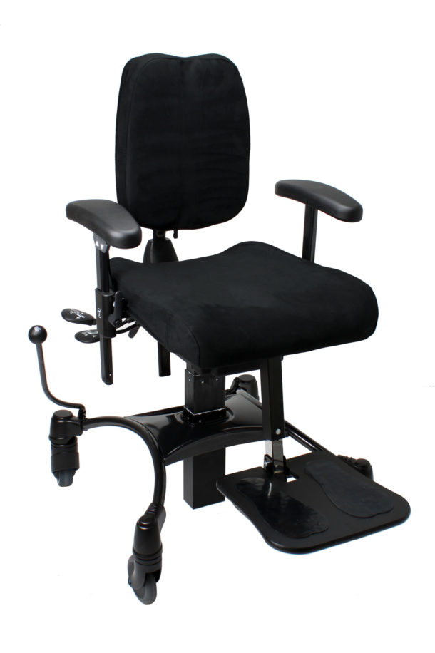 De hoogte van de rugleuning is zo gelijk mogelijk met de bovenzijde van de schouders, de voeten maken in het geheel contact met de voetenplaat en de knieën zitten in een hoek van 90 graden. Het bovenbeen moet op het zitkussen rusten.